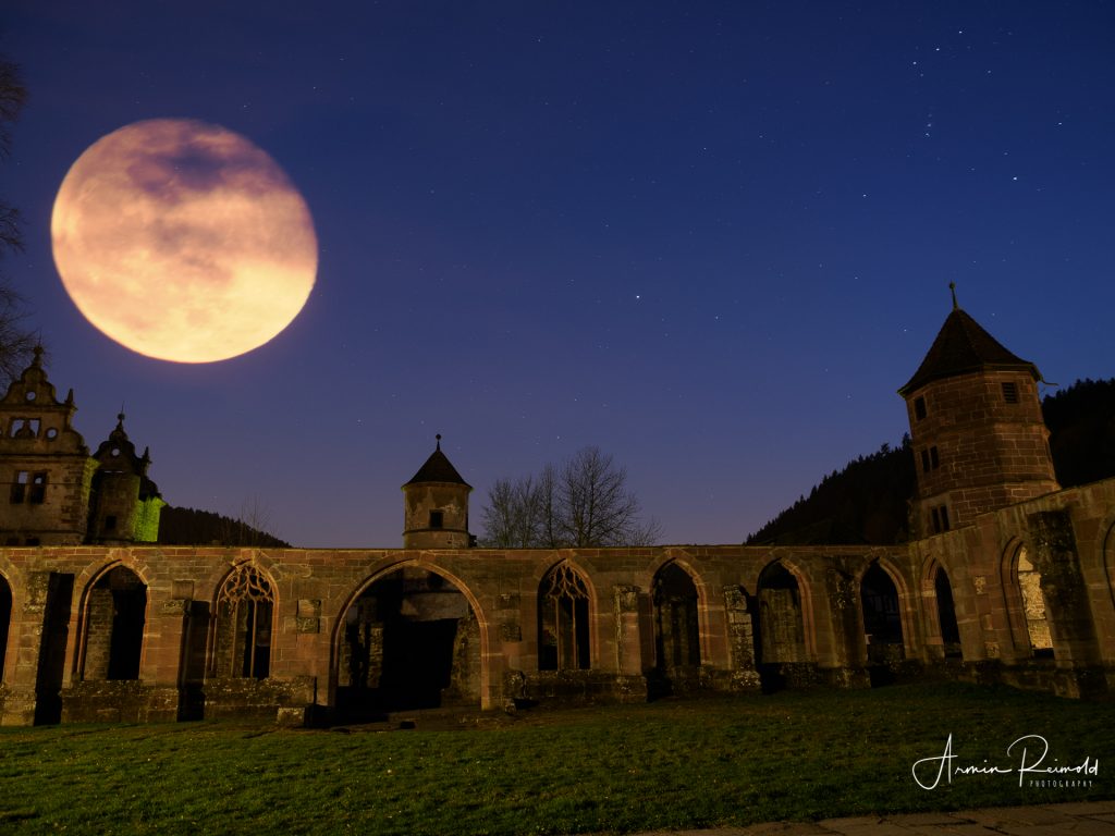 Doppelbelichtung in Kamera geht. Mond mit 400mm, Kloster mit 12mm fotografiert.